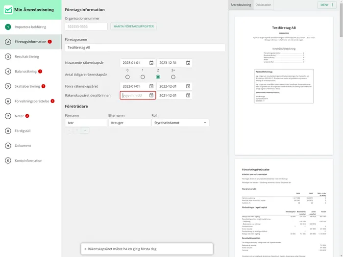 Här kontrollerar du företagsnamn, antal räkenskapsår och företagets företrädare. Endast företrädare som ska signera årsredovisningen behöver vara med i listan. Styrelsesuppleanter signerar normalt inte årsredovisningen men kan läggas till i listan om de ersätter en ordinarie styrelseledamot.